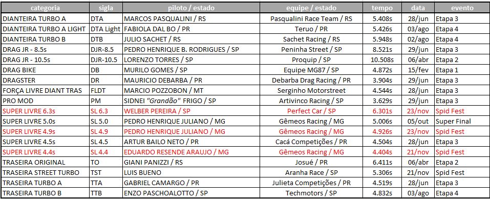 - Recordes sinalizados em vermelho são considerados TEMPOS DE REFERÊNCIA, uma vez que a sua respectiva categoria só possui 1 (um) evento realizado, sendo que a marca registrada estabelece o tempo de referência para as próximas etapas.